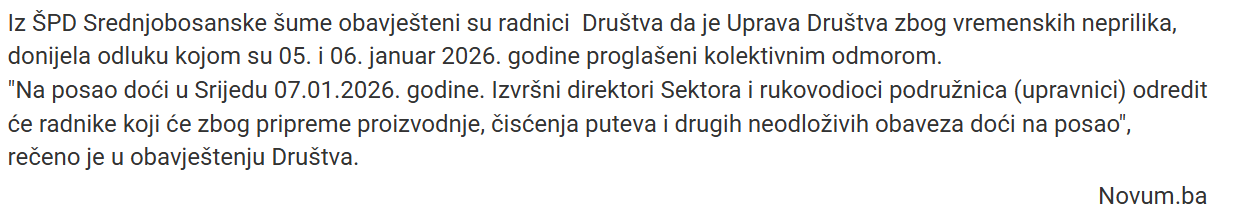 Home»Srednjobosanski kanton»ŠPD Srednjobosanske šume: 5. i 6. januar 2026. godine zbog vremenskih neprilika proglašeni kolektivnim odmorom