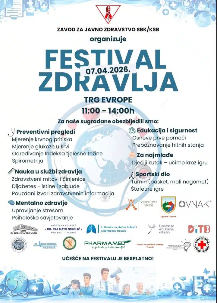 Zavod za javno zdravstvo SBK sa zadovoljstvom najavljuje obilježavanje Svjetskog dana zdravlja, 7. aprila, kroz organizaciju Festivala zdravlja, koji će se održati na Trgu Evrope u Travniku, u periodu od 11:00 do 14:00 sati.